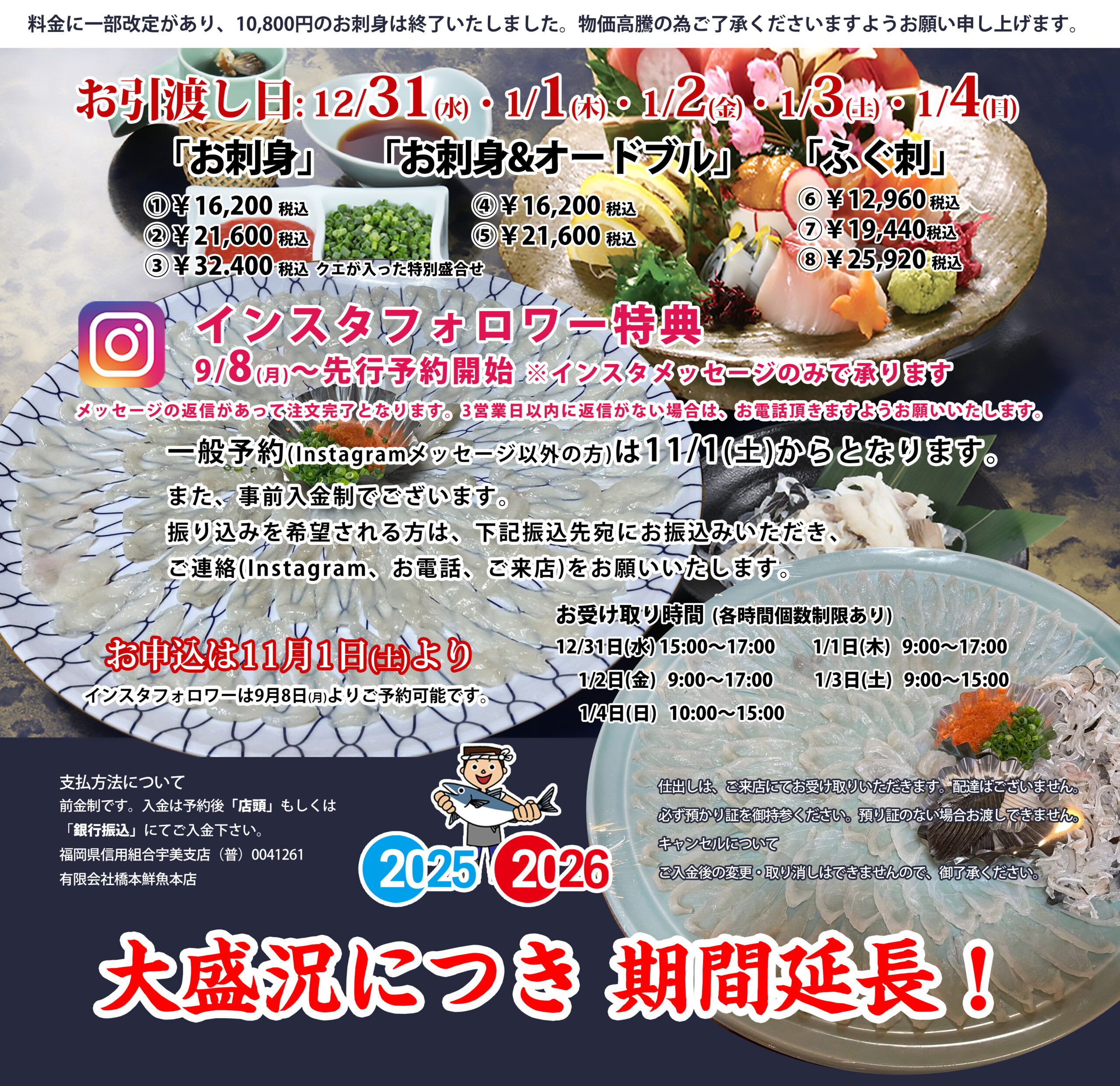 橋本鮮魚本店は、1915年の創業から2025年3月で110周年を迎えました。これもひとえに、お客様、ご関係者様の皆様の長年にわたるご愛顧の賜物と感謝いたしております。創業以来、常に「お客様第一」を経営理念におき努力を積み重ねてまいりました。